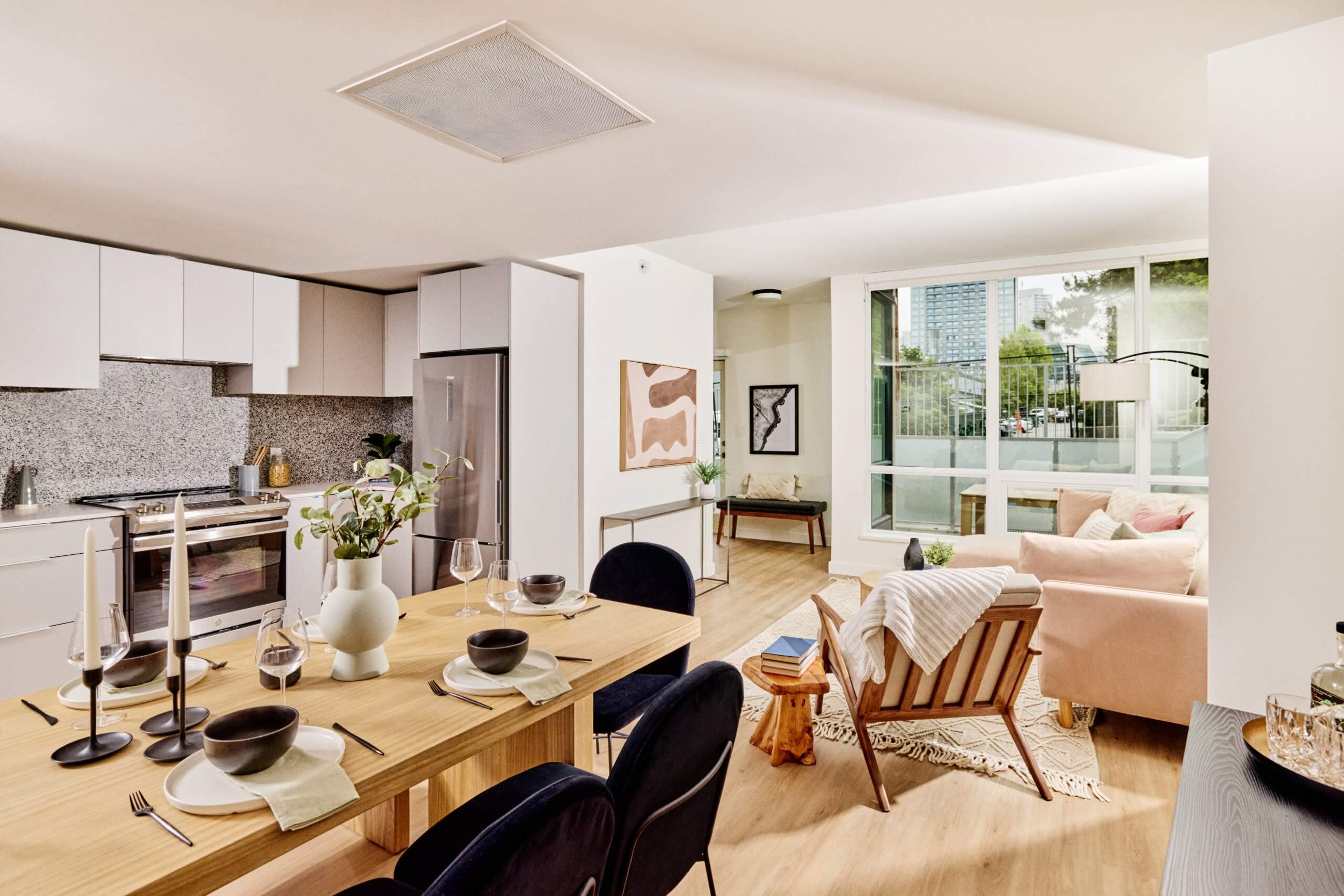 Our homes are all fully air-conditioned, featuring modern kitchens with quartz countertops and full-height backsplash, with top-of-the-line built-in appliances and your own full-size in-suite laundry. With spaces to gather, work and play. From private Karaoke rooms, co-work spaces, a rooftop lounge and an expansive gym – everything you need is right at home.